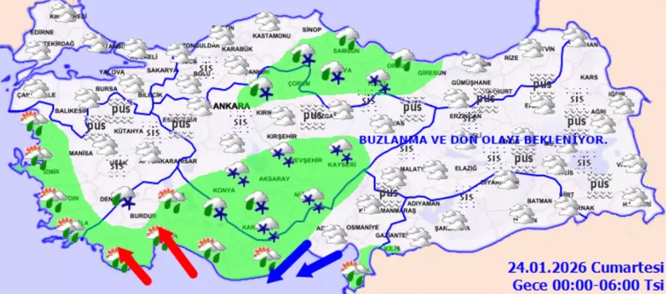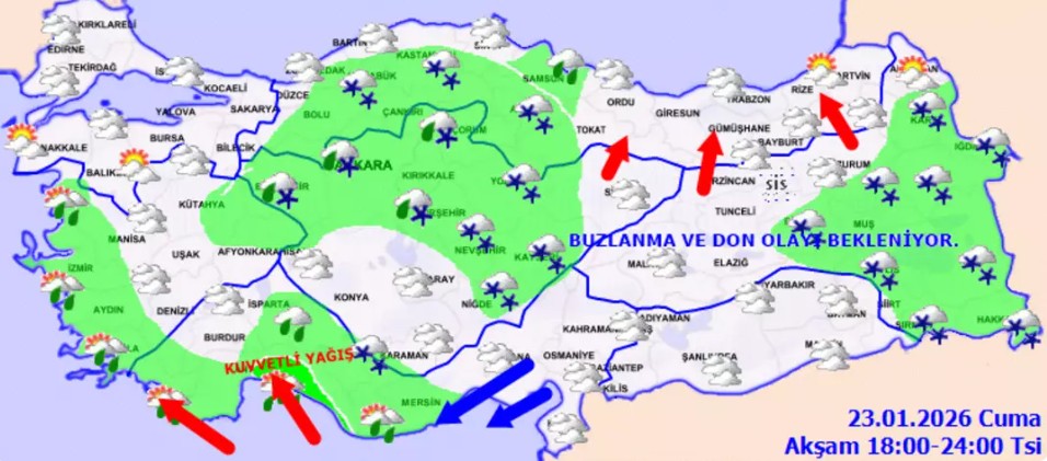 Meteoroloji’nin saatlik tahminlerine göre, yağışlar kıyı kesimlerde şiddetli sağanak, iç bölgelerde ise yoğun kar şeklinde gerçekleşecek. Ulaşımda aksamalar, buzlanma ve don olaylarına karşı vatandaşların çok dikkatli olması gerekiyor.